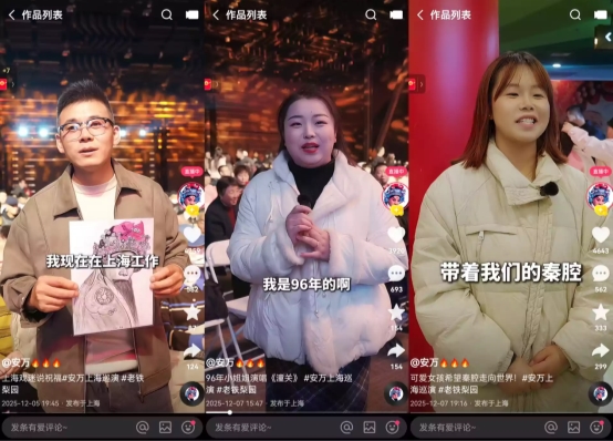 这场上海巡演,也是安万2025年“破圈之路”的又一关键节点。这一年,他从西北县城走向全国:1月在平凉的演出引发万人空巷,当地用烟花秀和无人机表演为他送行;8月在北京与歌手萨顶顶跨界协作《缘分一道桥》,秦腔与盛行音乐的融合招揽千万次观看;10月重阳节,他带着剧团在延安开展公益演出,为老人捐赠过冬物资,发起的“戏曲万人云合唱”话题播放量突破5.1亿次……每一步足迹,都见证着秦腔的传播之路越走越宽。