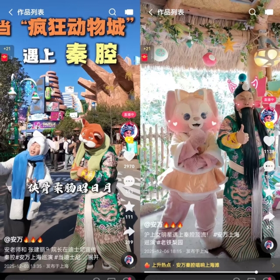 “狐兔同心天地鉴,情谊花好月又圆……”12月3日清晨,上海迪士尼乐园的卡通旋律中突然闯入一段激昂的秦腔——安万身着简洁戏服,在迪士尼即兴开唱,独特的声线瞬间招揽了大批游客。