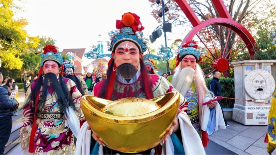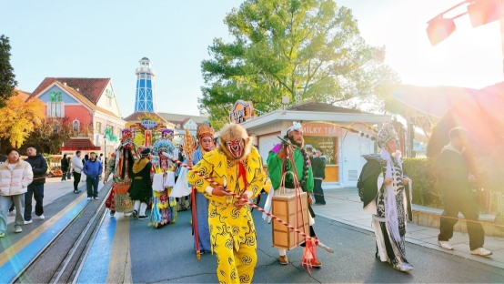 当天下午在欢乐谷的花车巡游中,秦腔元素重新变成焦点。剧团演员们化身财神、关羽、孙悟空等经典角色,身着精致戏服,在巡游流程中表演甩袖、亮相等基本功,与沿途的二次元coser互动合影。