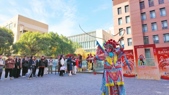 12月4日的城市快闪,剧团更是带着秦腔走进复旦大学,为常规艺术注入青春活力。剧团演员现场展示水袖功,甩袖、收袖间行云流水;武生演员的把子功表演更令人叫绝,花枪在手中旋转如飞,尽显秦腔武戏的刚劲力量。剧团的乐师还用唢呐、二胡演绎《天宫迅音》及多首现代歌曲,熟悉的旋律经由常规民乐诠释,赢得现场掌声持久。